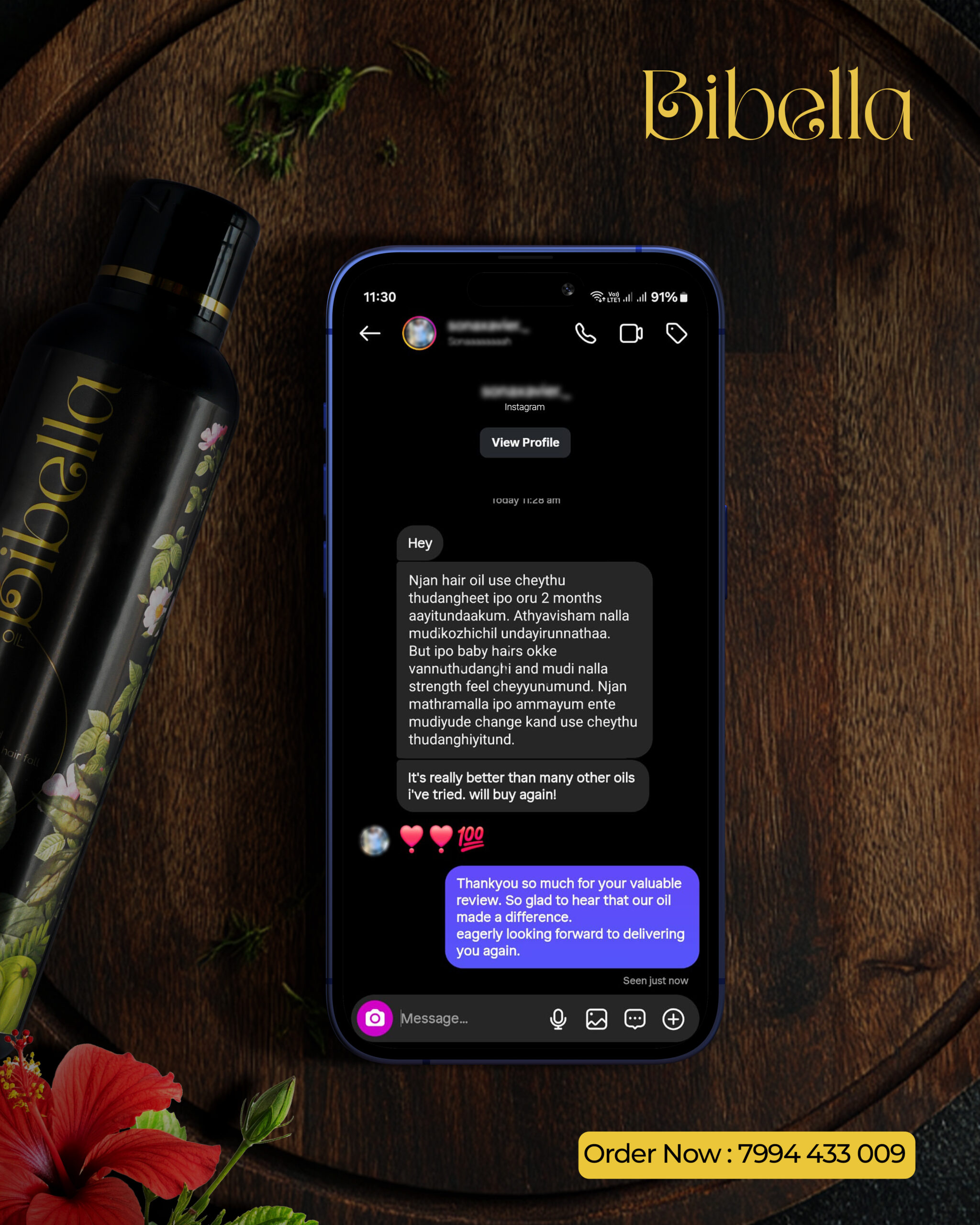 "Bibella Hair Oil has transformed my hair! I used to have so much hair fall, but now it's visibly thicker and healthier. Love the fragrance too!."